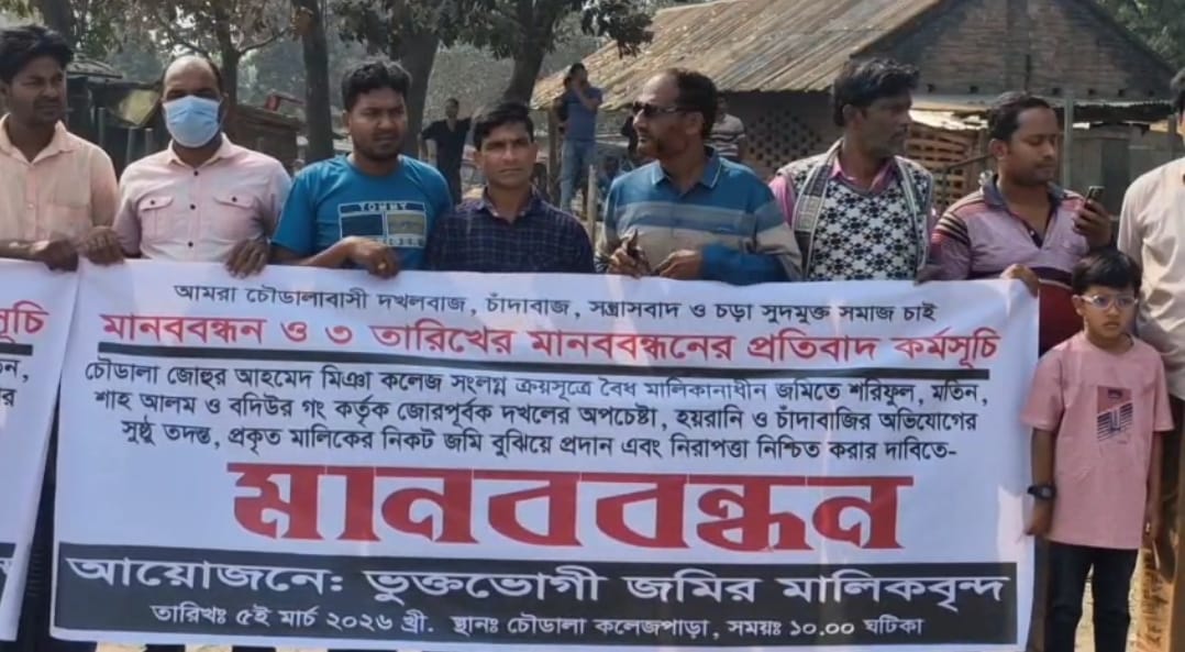 চাঁপাইনবাবগঞ্জে জোরপূর্বক জমি দখল ও চাঁদাবাজির বিরুদ্ধে মানববন্ধন