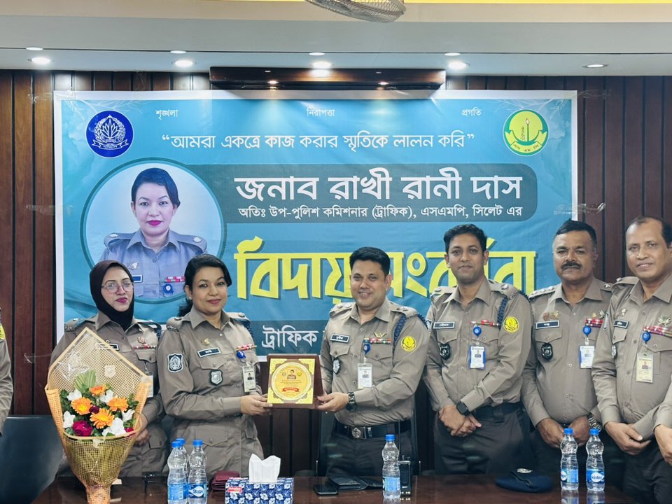 অদ্য ০৮/১২/২০২৫খ্রিঃ তারিখ ট্রাফিক বিভাগ, সম্মেলন কক্ষে জনাব রাখী রানী দাস, এডিসি (ট্রাফিক), এসএমপি, সিলেটে এর বদলি জনিত বিদায় সংবর্ধনা