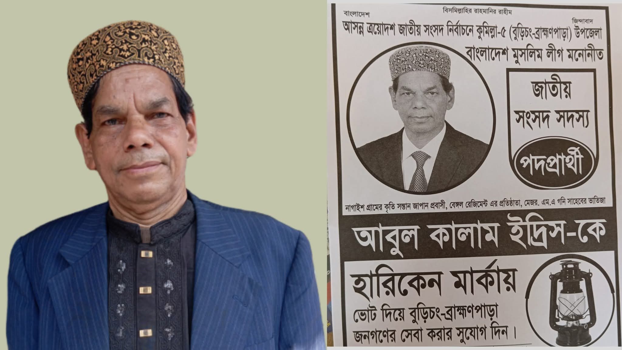 আসন্ন ত্রয়োদশ জাতীয় সংসদ নির্বাচনে কুমিল্লা-৫ (বুড়িচং-ব্রাহ্মণপাড়া) উপজেলায় বাংলাদেশের মুসলিম লীগ মনোনীত জাতীয় সংসদ সদস্য পদপ্রার্থী আবুল কালাম ইদ্রিস প্রতিশ্রুতিবদ্ধভাবে