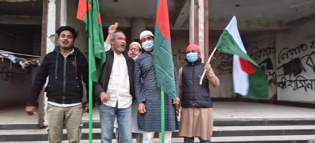 পতাকা হাতে নওগাঁ জেলা আওয়ামী লীগ অফিসের সামনে জয় বাংলা স্লোগান