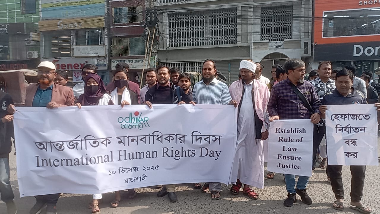 রাজশাহী প্রতিনিধি আন্তর্জাতিক মানবাধিকার দিবস ২০২৫ উপলক্ষে মানবাধিকার সংগঠন ‘অধিকার’ রাজশাহী মহানগরীর চেম্বার ভবনের সামনে মানববন্ধন ও র্যালির আয়োজন করে।